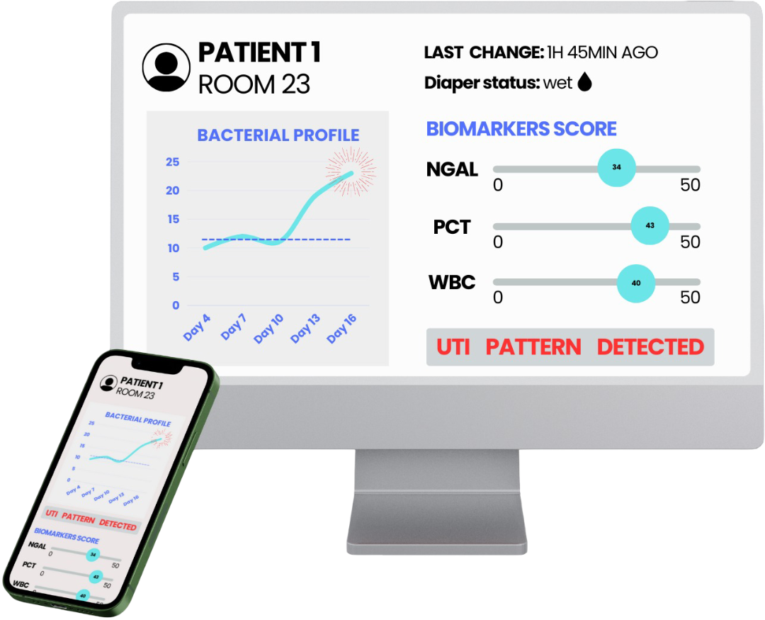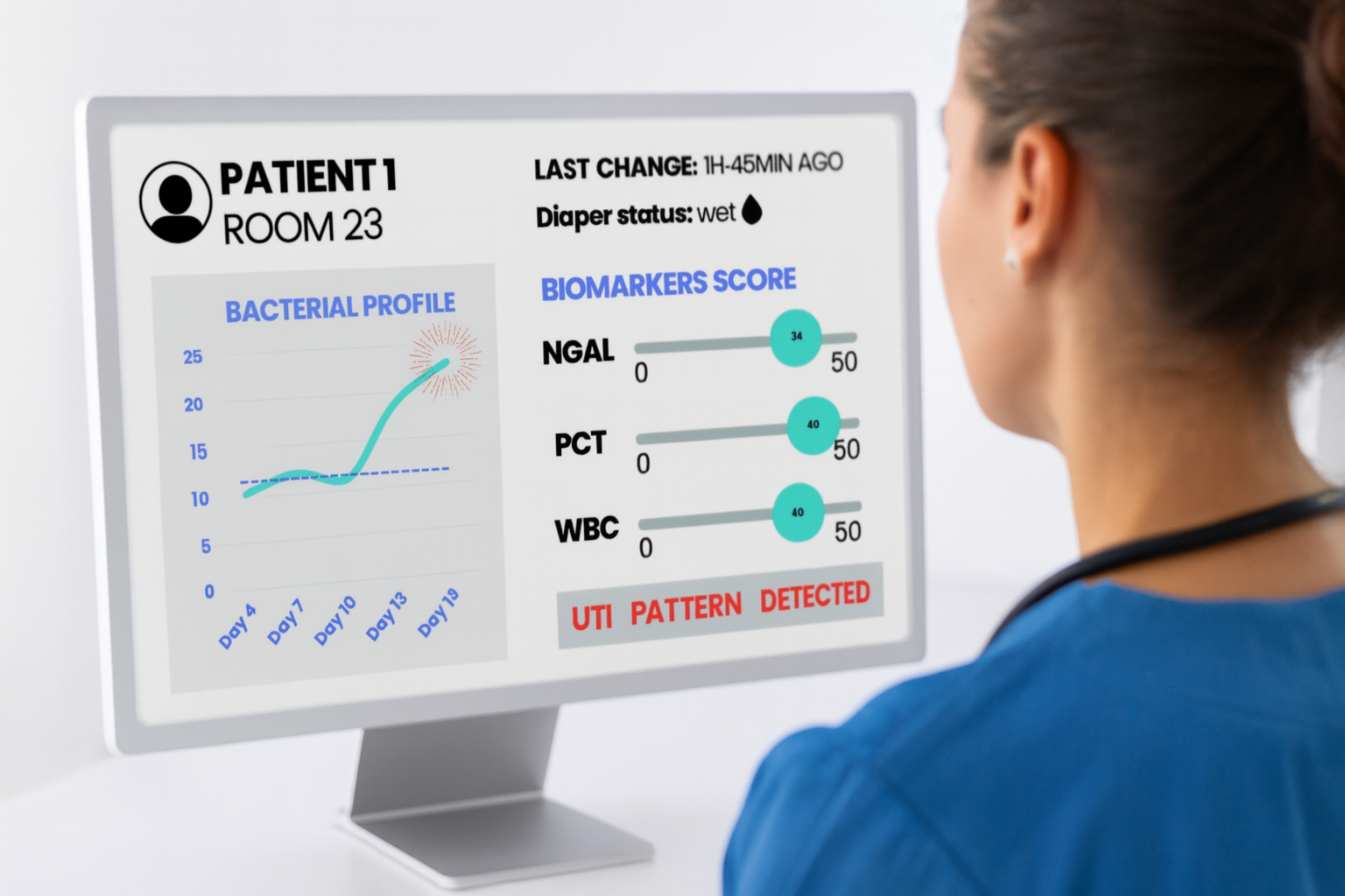 Our smart diapers track real-time biomarker data and use AI to flag early infection risk, giving care teams the clarity they need to act quickly.